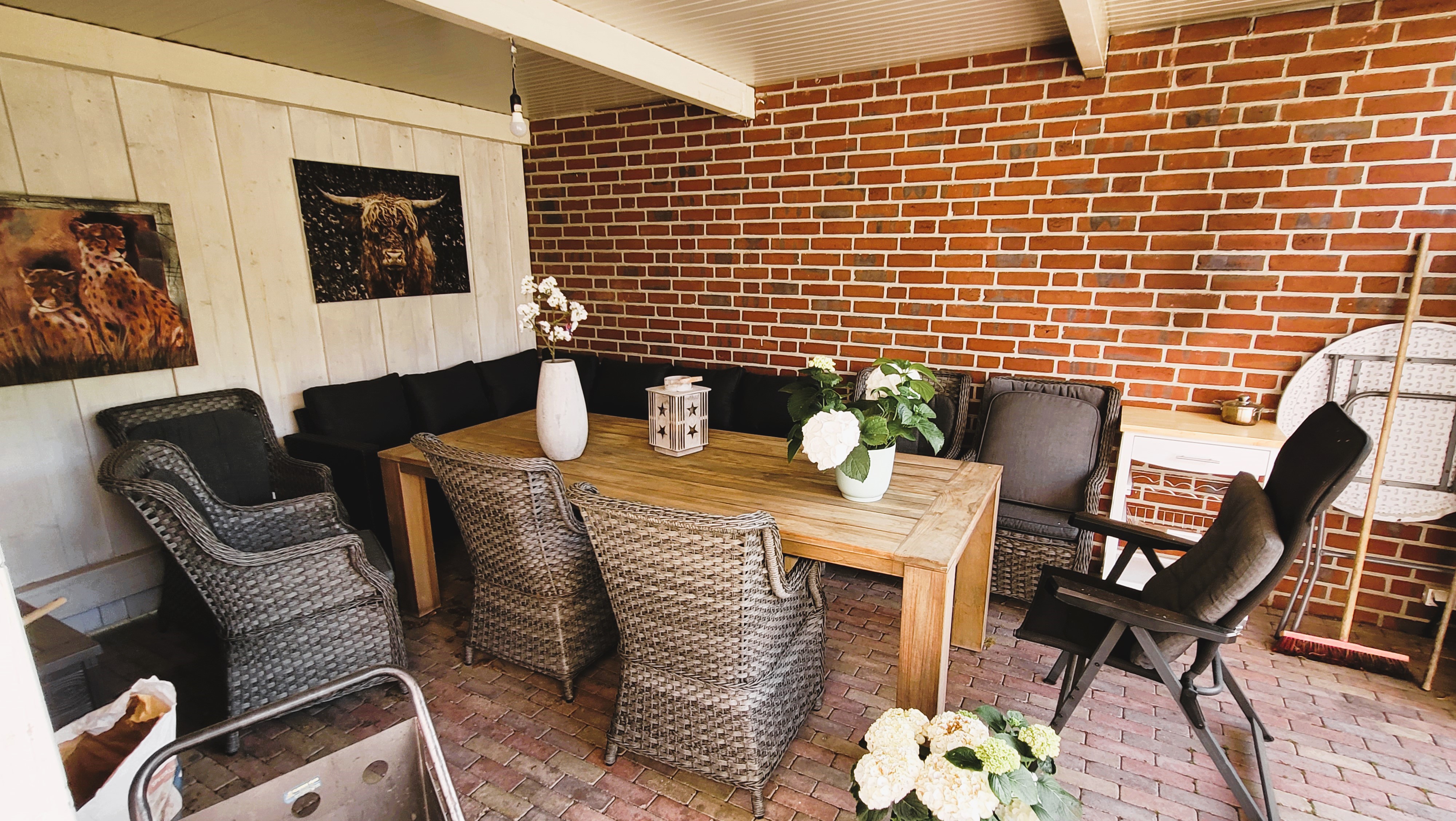 • Überdachte Terrasse: Die urgemütliche, überdachte Terrasse lädt zum Entspannen und Verweilen ein, egal bei welchem Wetter.