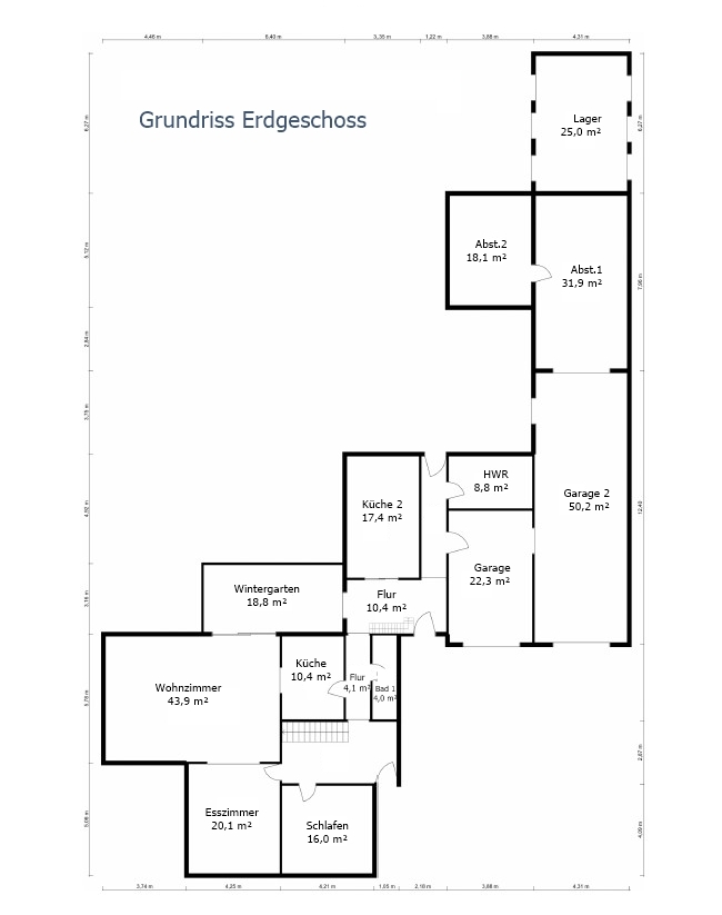 Zwei großzügige Garagen bieten nicht nur Platz für Ihre Fahrzeuge, sondern verfügen über rückwärtige Anbauten mit vielfältigen Nutzungsmöglichkeiten. Ob Werkstatt, Hobbyraum, Lagerfläche oder ein stilvoller Partyraum – hier ist Ihrer Kreativität keine Grenze gesetzt.