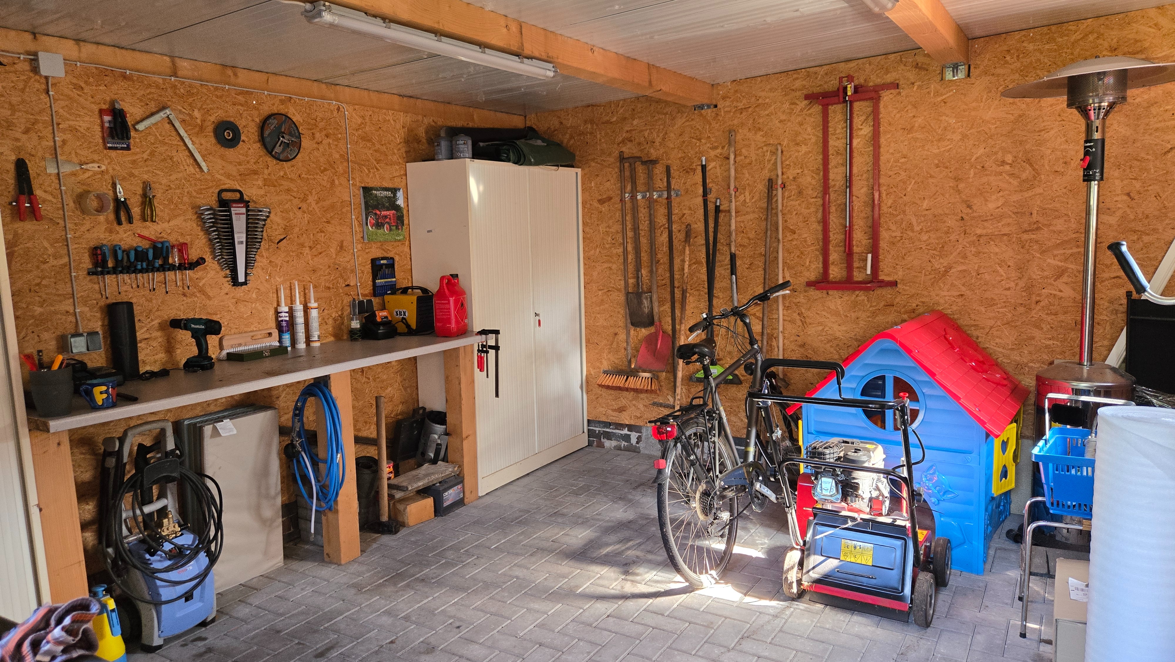 Ein weiterer Pluspunkt ist die Garage mit direktem Zugang zum Haus, die für Komfort bei jedem Wetter sorgt. Zusätzlich befindet sich im Garten eine praktische Werkstatt, die ideale Bedingungen für Handwerker oder Hobbybastler bietet.