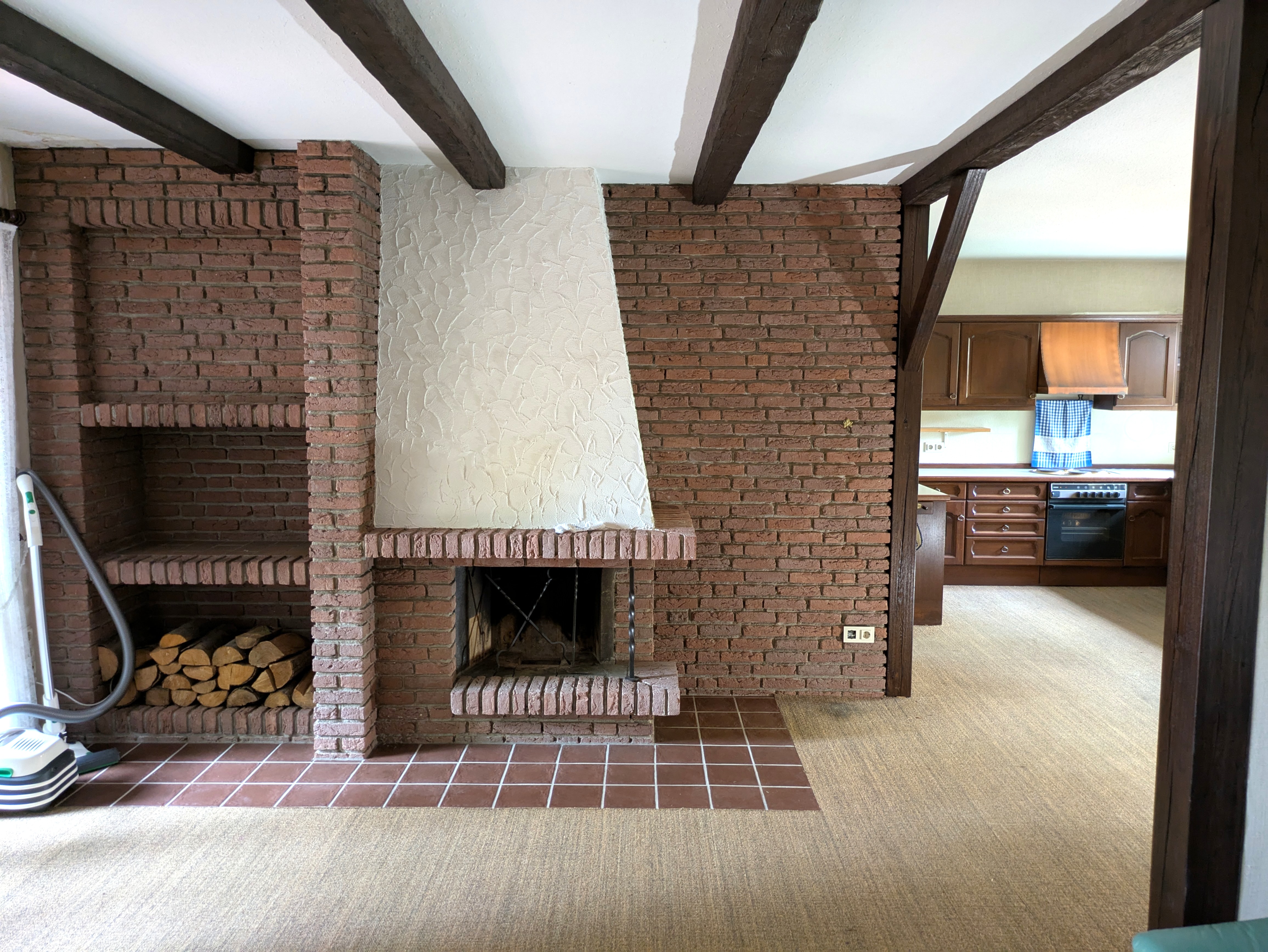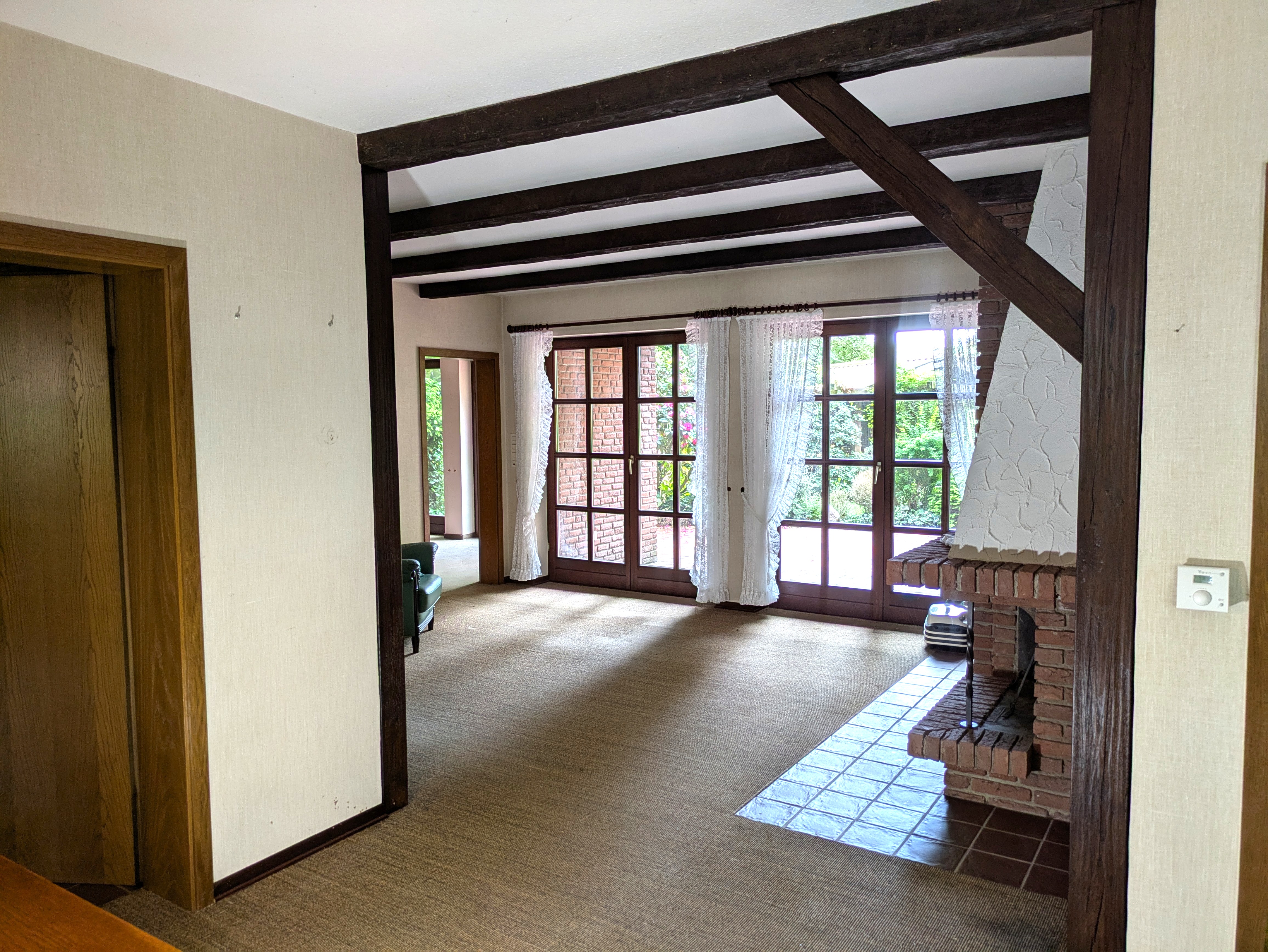 Ein besonderes Highlight ist die offene Wohnküche, die sich als größter Raum des Hauses über die gesamte Tiefe erstreckt. Der offene Übergang von der Küche im vorderen Teil des Hauses hin zum Wohnzimmer schafft ein helles, einladendes Raumgefühl, perfekt für gemeinsames Kochen, Essen und Entspannen. Im Wohnzimmer sorgt ein Kamin für eine behagliche Atmosphäre, während der direkte Zugang zur Terrasse das Wohnerlebnis in den Garten verlängert.