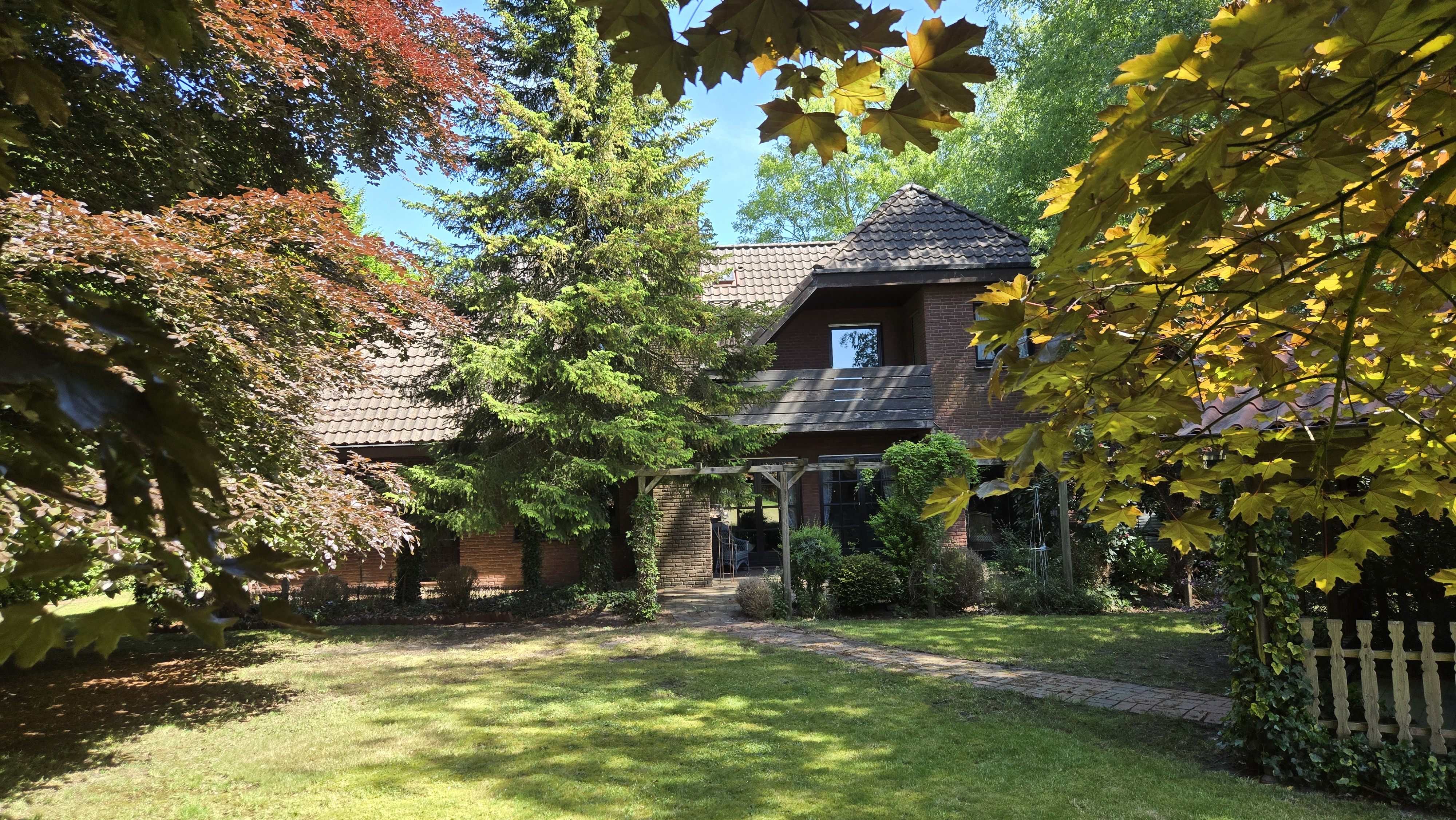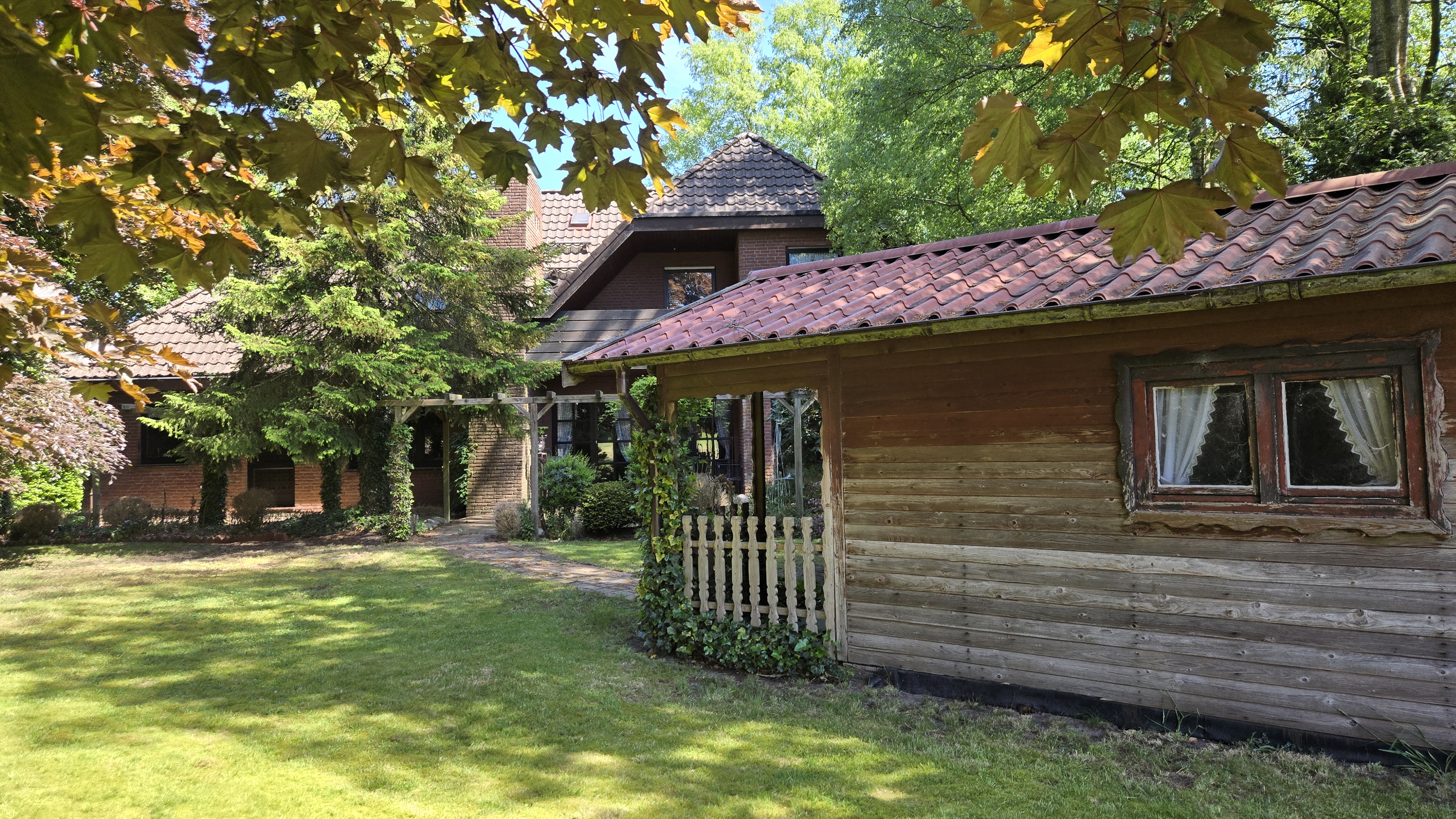 Der Außenbereich ist liebevoll angelegt und ebenso gepflegt wie das Haus selbst. Hier erwarten Sie ein weitläufiger Garten mit viel Grün, eine Blockhütte für Hobby oder Stauraum sowie eine schöne Terrasse zum Genießen der Ruhe und Natur. Im Obergeschoss befinden sich fünf flexibel, nutzbare Räume. Zwei davon mit Zugang auf den Balkon mit Blick in den hinteren Garten und über das angrenzende freie Land das Gesamtbild harmonisch ab, ein idealer Ort für den ersten Kaffee am Morgen oder entspannte Abendstunden.